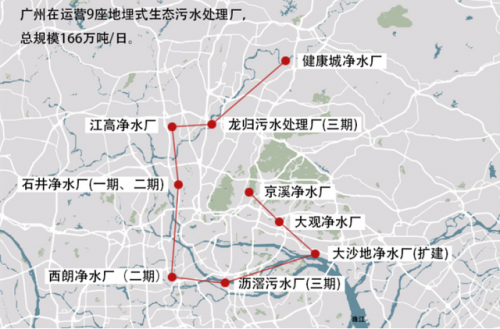 從2010年建成全國首座地埋式膜處理工藝凈水廠——京溪地下凈水廠、2018年初建成全市第二座采用地埋式構造的污水處理廠——石井凈水廠(一期)到如今,廣州中心城區累計建成地埋式污水處理廠9座,呈北斗狀分布于珠江兩岸,被譽為“地下北斗9星”。9座地埋式污水處理總產能181萬噸/日,占廣州中心城區污水處理總產能的三分之一,占全國同類污水處理模式總產能規模的五成以上。