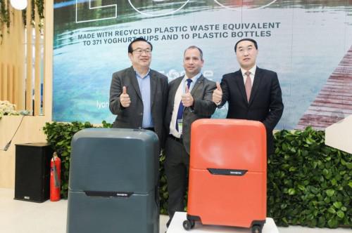 在蘇伊士展臺上,新秀麗集團大中華區總裁馬瑞國、利安德巴賽爾中國合資企業管理及聚烯烴業務副總裁付立民、蘇伊士亞洲地區固廢資源管理固廢基建及新服務業務總監古山主持揭幕儀式,攜手推出由回收塑料制成的可持續發展系列旅行箱,展示了三方共同致力于減少碳足跡,賦予塑料廢棄物第二次生命,減少原始材料的使用的愿景。